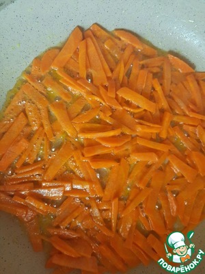 Обжаривайте морковь на слабом огне, пока она не станет отдавать оранжевый цвет маслу (на фото постаралась показать этот момент).