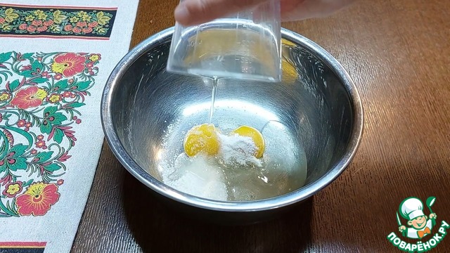 Готовим песочное тесто. Для этого смешиваем 2 желтка, 40 г сахара, щепотку соли, 1/3 ч. л. ванилина и 50 мл растительного масла.