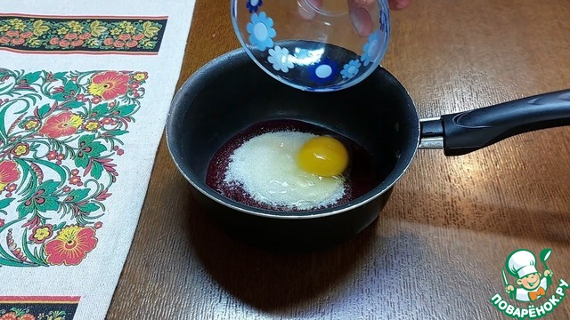 К полученному ягодному пюре добавляем 50 г сахара и 1 среднее яйцо. Всё перемешиваем. Туда же отправляем 25 г сливочного масла и отправляем сотейник на средний огонь.