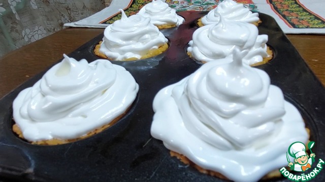 Перекладываем взбитые белки в кондитерский мешок или простой пакет, отрезав затем уголок. Достаем из духовки пирожное и делаем "шапочку" из взбитых белков. Запекаем последний раз - 10 минут.