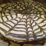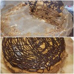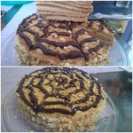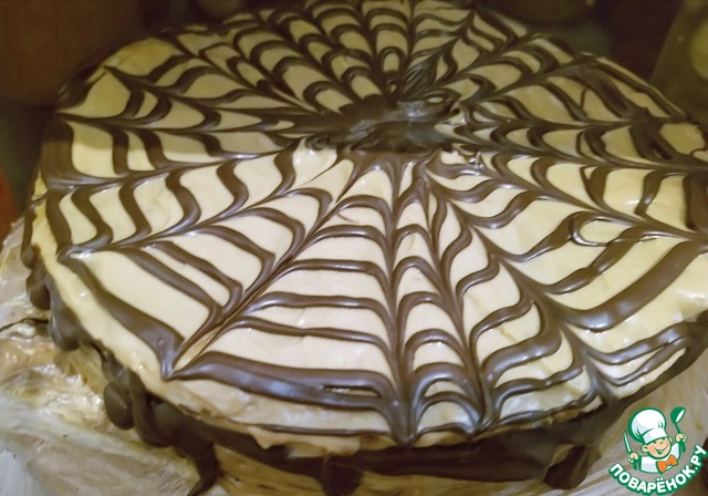 Собираю торт. Все коржи обильно смазываем кремом. Верх торта буду украшать растопленным шоколадом переложив его в кондитерский мешочек. Провожу по кругу начиная с центра торта, затем деревянной палочкой провожу как показано на видео каждый раз вытирая палочку. Торт отправляю в холодильник на 4-5 часов, а лучше на ночь.