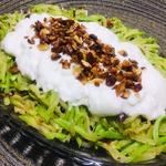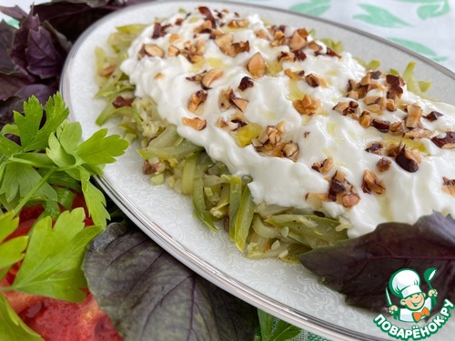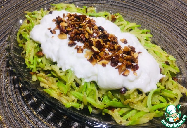 Собираем наш салатик непосредственно перед подачей на стол, тк йогурт выделяет сыворотку и может испортить эстетический вид. На тарелку выкладываем кабачки, сверху йогурт и посыпаем ранее отложенным миндалем. Приятного аппетита!