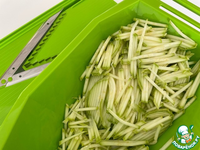 Для салатика используем кабачок среднего размера с тонкой шкуркой и без семечек. Кабачок моем и натираем или режем соломкой (толщина макарон).