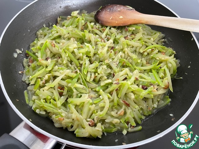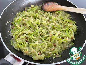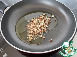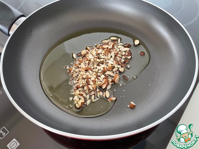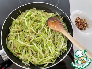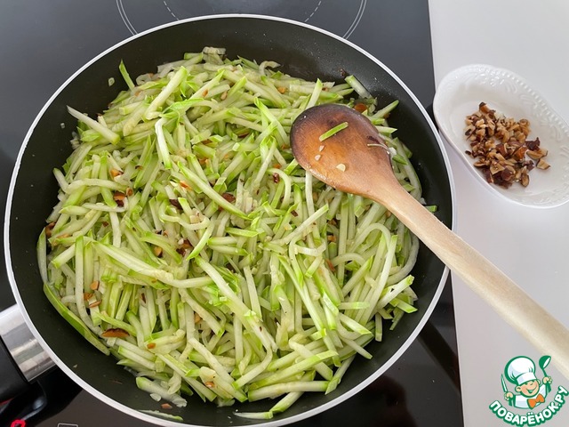 Половину миндаля откладываем на тарелку. К остальному миндалю в сковороде добавляем кабачки и обжариваем, помешивая, не убавляя огонь, 5 минут.
