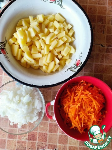 Подготавливаем овощи. Картофель нарезать кубиками. Для пережарки - морковь натереть на тёрки, лук нарезать кубиками.