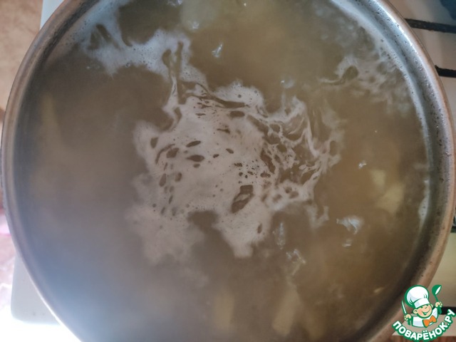 Дожидаемся закипания, и добавляем пережарку и остывшее мясо. Солим, перчим. Убавляем огонь и держим несколько минут.