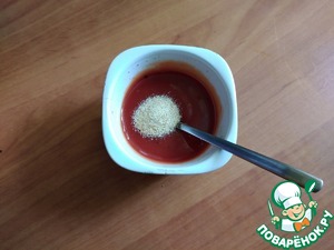 Пока митлоф стоит в духовке, делаем соус. Томатный кетчуп соединяем с яблочным уксусом, мёдом, перцем чёрным молотым и солью. На соль пробуйте!