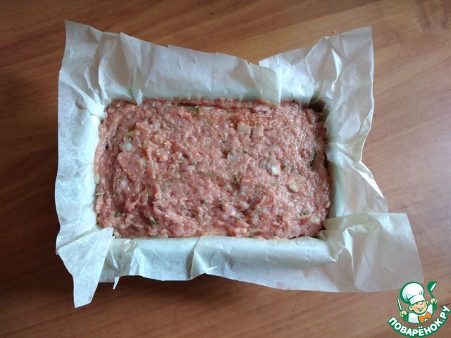 Берём форму размером 11 см Х 17 см Х 4 см. Выстилаем её пекарской бумагой и выкладываем фарш. Этого фарша ровно на такую форму. Если таковой нет, то возьмите какую-то подходящую. Ставим в духовку на 40 минут при т-200 С.