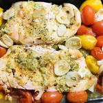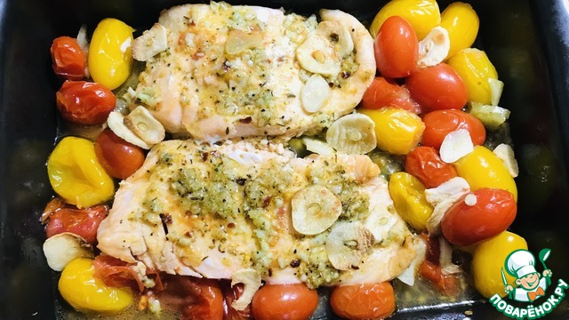 Припорошить рубленой зеленью, выложить шайбы чеснока, разложить черри. Отправить в духовку.