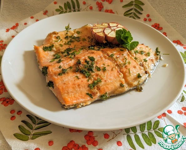 Запекать 10-15 минут, 200 градусов. Смазать образовавшимся соком и запекать ещё 10 минут, 220-230 градусов. Подать рыбу горячей.