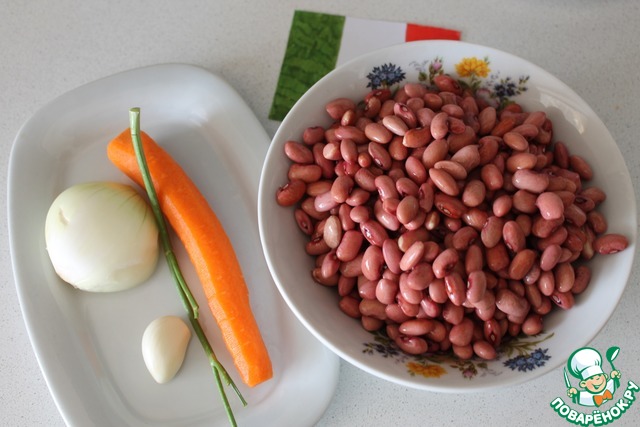 Первым делом нужно замочить фасоль на ночь. Утром воду слить, фасоль промыть. Морковь, лук и чеснок почистить.