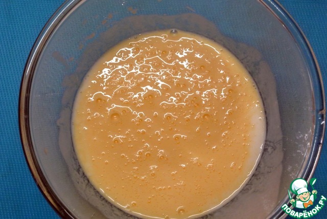 В кефир вбить яйца, размешать.