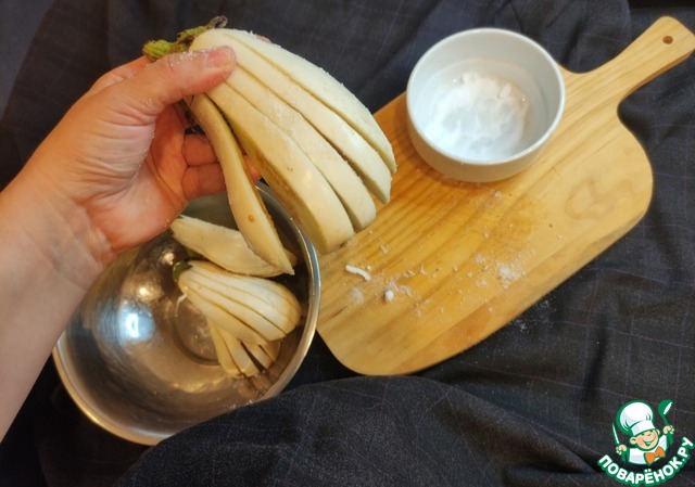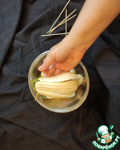 • Верхнюю часть у плодоножки укрепляем шпажкой, переворачивать удобно будет.