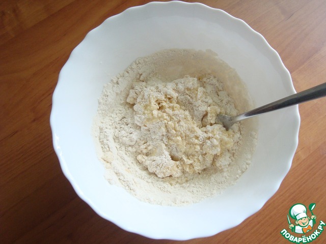 Муку перемешиваем с содой. Добавляем просеянную муку и соединяем. Я соединяла вначале при помощи вилки.