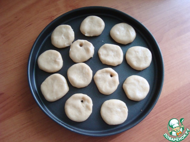 Формируем из теста шарики размером с грецкий орех. Берём противень застилаем его пекарской бумагой. Я возьму антипригарную форму для пиццы. Расплющиваем шарики и выкладываем на форму на расстоянии друг от друга. Печенья в процессе выпечки подрастут.