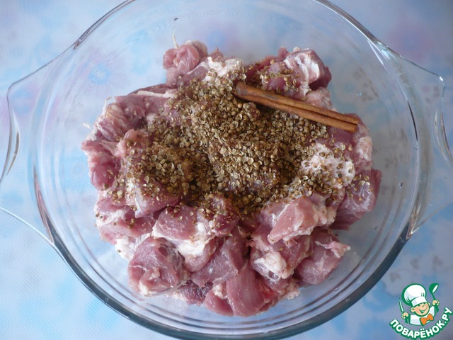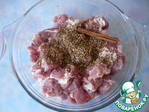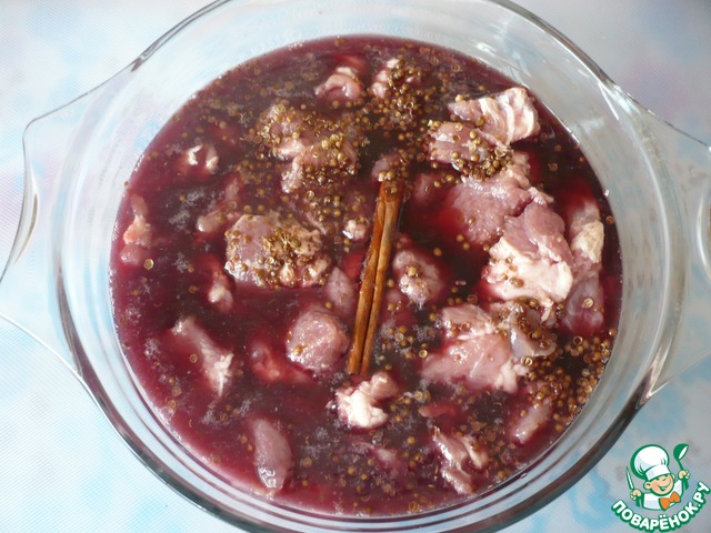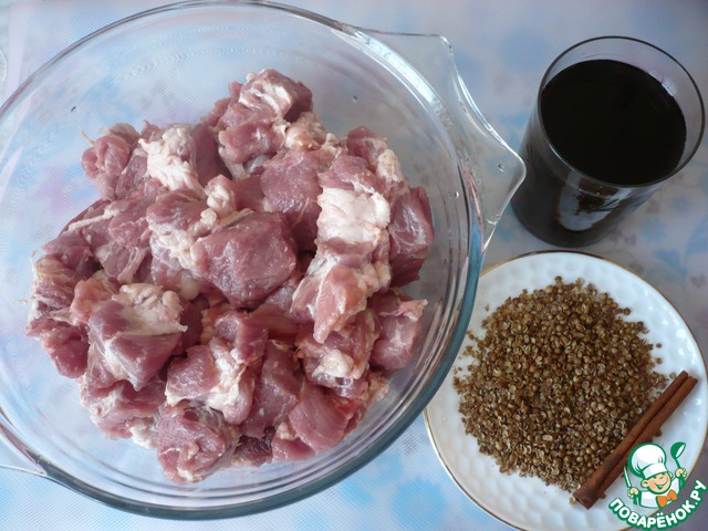 Ингредиенты для маринования: нарезанное мясо свиной шейки, кориандр, палочка корицы, сухое красное вино.
