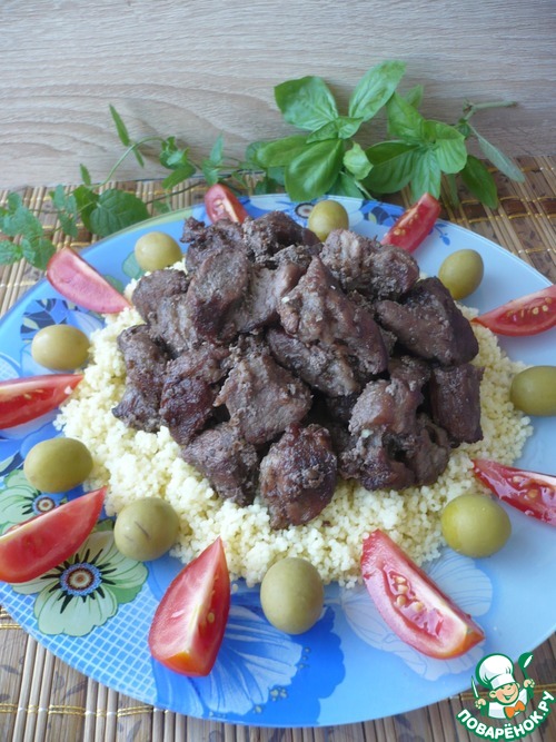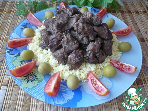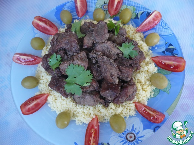 Блюдо я подавала с кус кусом, украсила оливками и помидорами, можно посыпать кинзой.