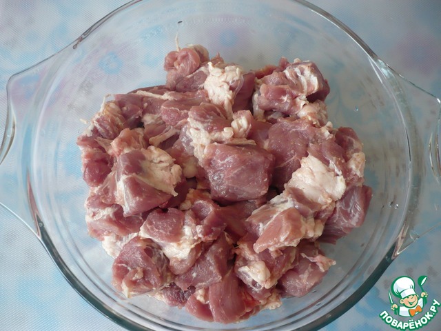 Залить кусочки свиной шейки со специями сухим красным вином и оставить мариноваться минимум 1 час, а можно и на ночь. Мясо и маринад - не солить! Мясо поставить в холодильник.