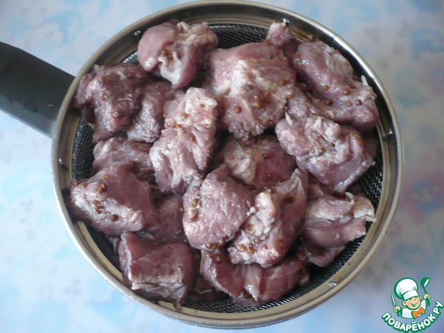 Кусочки замаринованной свинины откинуть на сито. Палочку корицы не убираем (маринад ни в коем случае не выливаем, а отставляем в сторону. Он нам будет нужен для приготовления блюда).