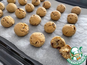 Печь 13 минут при температуре 175 градусов. При выпечке печенье потрескается, так и должно быть. На фото одно печенье разломлено для контроля готовности.