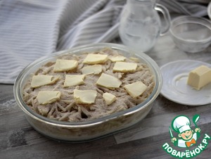 Поставить в хорошо разогретую духовку. У меня запекалось при 190* около часа, ориентируйтесь на особенности своей духовки.