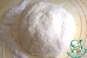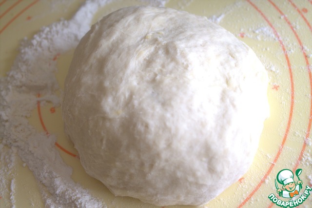 Как делала я. Раскатать тесто в прямоугольник, перенести пласт на обсыпанную мукой форму и слегка вдавить в ямку начинку.
