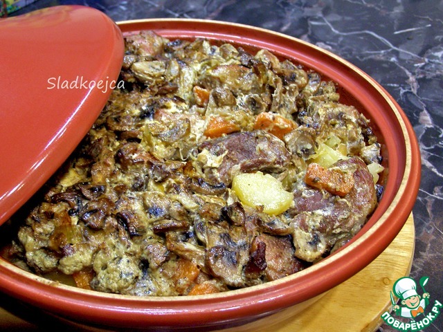 Затем берём 300 мл воды, добавляем 1 ст. л. сметаны и хорошо размешиваем. Слегка подсаливаем и добавляем в форму. Закрываем форму фольгой и отправляем тушить в заранее разогретую до 200°С духовку минут на 40-50. Ориентируйтесь по своей духовке. Это блюдо традиционно готовили в чугунках в печи, можно готовить в порционных горшочках, я же осовременнила рецепт для наших дней.