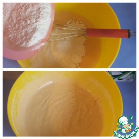 Добавить просеянную муку и разрыхлитель, быстро замесить тесто.