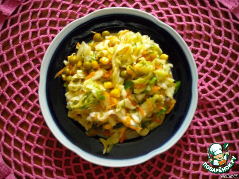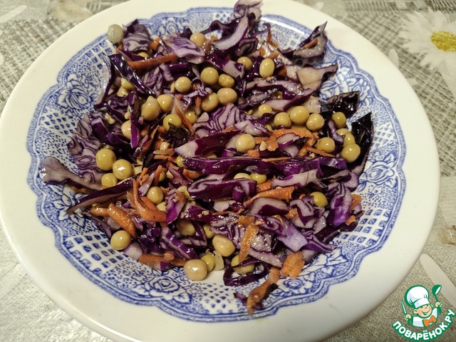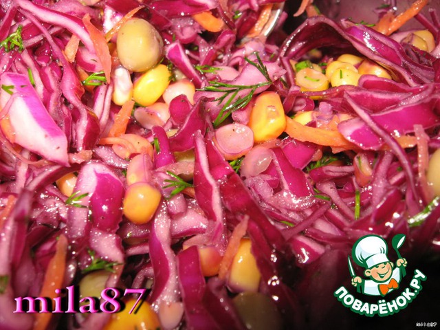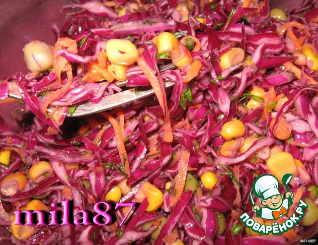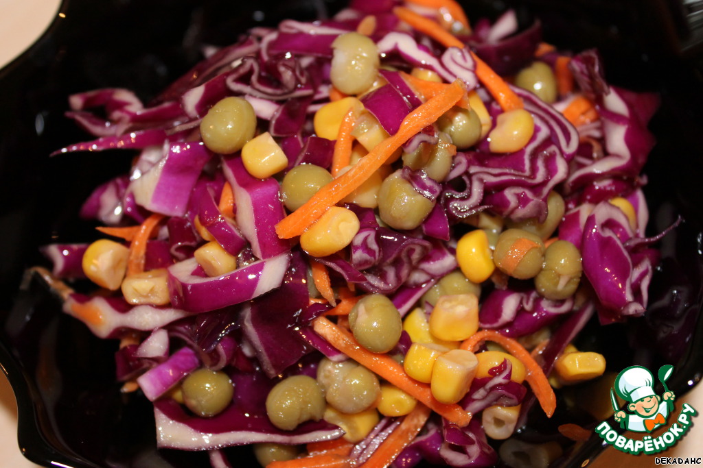 Замечательный, яркий, хрустящий и ароматный салатик из краснокочанной капусты, в сочетании со сладкой кукурузкой, пикантным зеленым горошкоми, хрустящей морковочкой... в обрамлении кислинки лимона и нежности оливкого масла, с легкой неповторимой ноткой кунжутного масла... БЕСПОДОБНОЕ СОЧЕТАНИЕ!!!