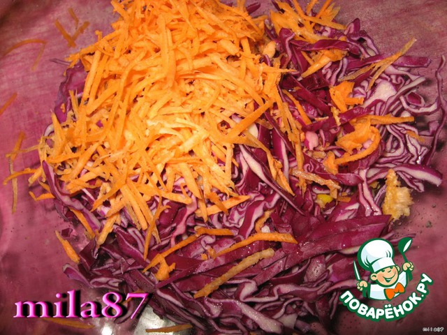Капусту шинкуем. переминаем ее руками с солью, чтобы сок пустила.