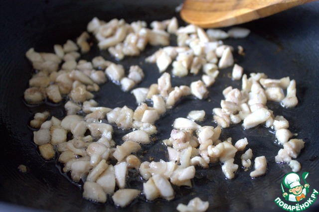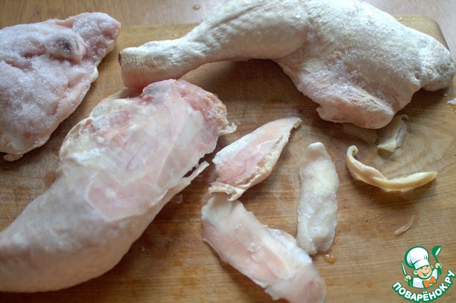 Накопить заранее в морозилке обрезки куриного жира. У меня такого жира не было, я обрезала с окорочков полоски жира с мясом.