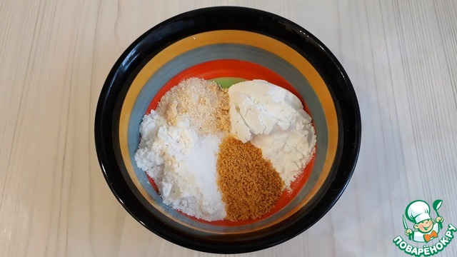 В миску добавить все сухие ингредиенты: муку - 2 ст. ложки, чесночный порошок - 2 ч. лложки., готовую приправу для курицы - 1 ч. ложка), черный молотый перец и соль добавить по вкусу, добавить крахмал (1 ст. ложка), соду (1/2 ч. ложка). Сухую смесь перемешать.