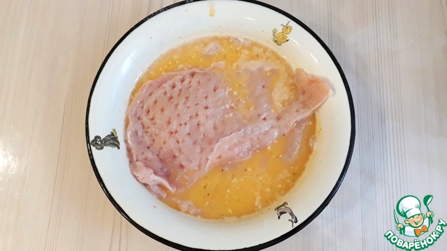 Куриное филе нарезать пластами толщиной 1-1,5 см., отбить с двух сторон. Поместить шницели в подготовленную смесь. Миску со шницелями оставить на 1 час.