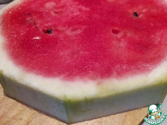 Арбуз разрезать кольцами поперёк и очистить от зеленой кожуры. Белая часть после квашения будет вкусной. Ширина разреза от 2 до 5 см. В этот раз у меня 4-5 см, поскольку я их буду квасить 10 дней до очень кислого состояния и объём уйдёт.