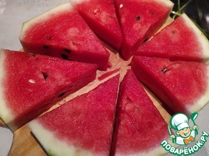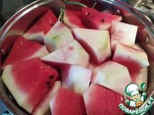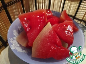 Итак, настал момент, когда Вы решили сделать заготовки (с 5-го по 10-й день). Берем кастрюлю, в которой квасился арбуз, сливаем рассол, ставим слитый рассол кипятиться. В стерилизованные банки раскладываем наши квашеные арбузы, заливаем кипящим рассолом, накрываем простерилизованными крышками и стерилизуем банки 20 минут.