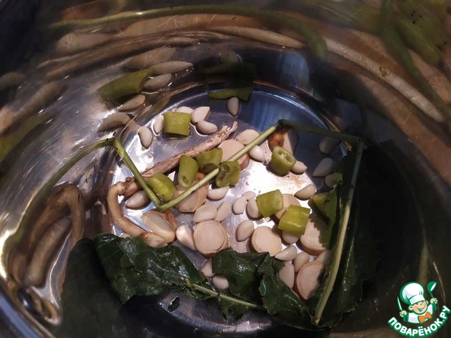 На дно кастрюли выкладываем лист хрена, горький перец (тут у меня 1,5 стрючка), 2 крупных очищенных головки чеснока. Сюда же можно добавлять любую зелень по вкусу, включая листья вишни, смородины, винограда.