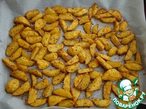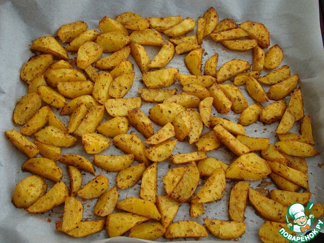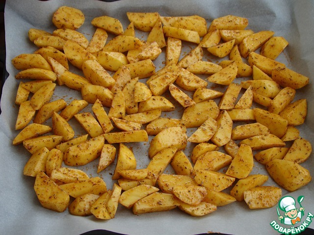 Картофель очистите и нарежьте крупным ломтиком. В миске смешайте картофель, специи, 1 ч. л. соли и 2-3 ст. л. растительного масла. Выложите на противень и поставьте в разогретую до 170-180* духовку примерно на 20 минут, до румяной корочки.