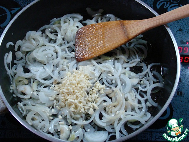 В этой же сковороде обжарьте до легкого золотистого цвета нашинкованный репчатый лук. Затем добавьтеь измельченный чеснок и слегка обжарьте вместе с луком.