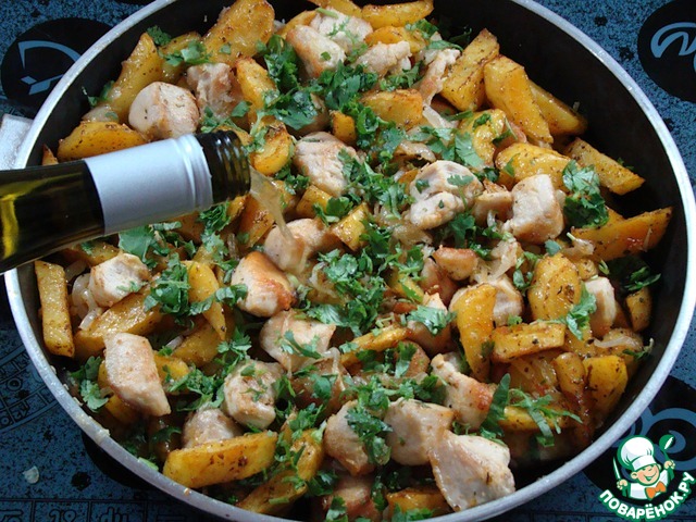 В сковороде смешайте куриное филе, картофель, обжаренный с чесноком и луком. Добавьте нашинкованную зелень кинзы и базилика, влейте белое сухое вино и потушите под крышкой минут 5-10.