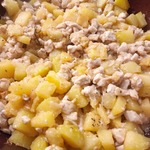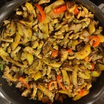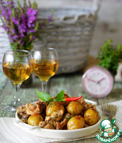 Столкнулась с некоторыми трудностями при приготовлении: за 15 минут в духовке на 180 картофель остался сильно недоготовлен и тушение 10 минут в вине его также не доготовили, пришлось доливать немного воды и тушить ещё минут 20. Также проблема была с посудой. Два килограмма картофеля и кило курицы не вошли ни в одну мою сковородку, выручила толстостенная кастрюля, все смешивала и тушила в ней. Но хуже от этого не стало, вкусно, красиво, свежо!!! Спасибо!!!