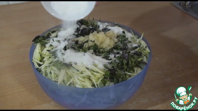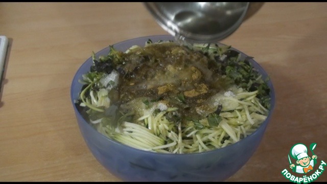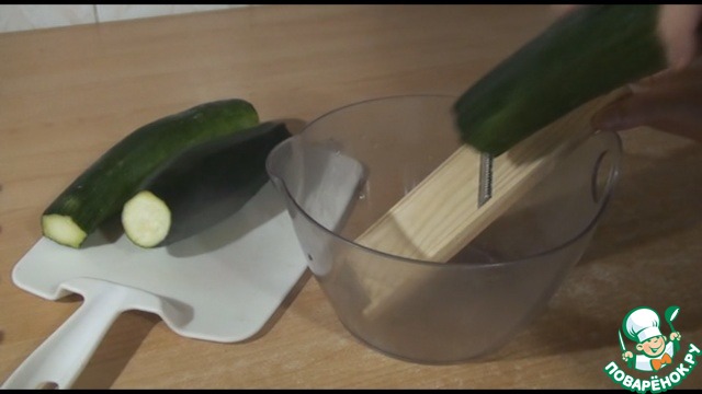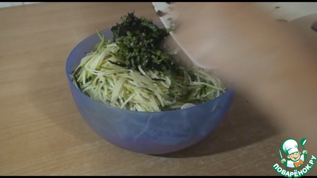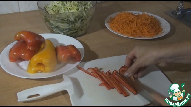 Кабачки и морковь натереть на терке для корейской моркови. У меня цукини молоденькие, я терла с кожицей.