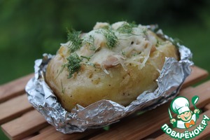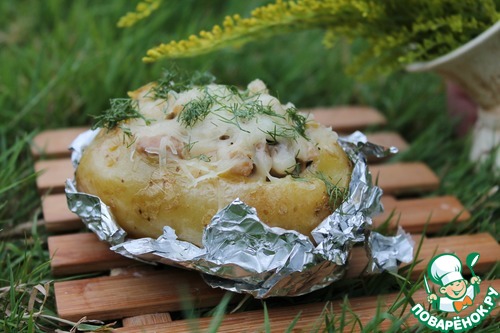 У запечённого картофеля аккуратно убрать верхнюю часть фольги, чтобы получилась как бы формочка. Чайной ложкой удалить часть картошки до середины. Наполнить получившиеся лодочки начинкой, посыпать сыром и отправить на 5-10 минут в духовку, чтобы сыр расплавился.