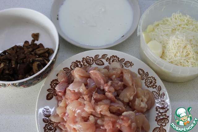 Для начинки подготовить филе бедра, нарезать его небольшим кубиком. Грибы у меня были замороженные, а если использовать свежие, то их помыть и также нарезать. Сыр натерететь на мелкой тёрке. На сковороде сначала обжарить филе, затем добавить грибы, грибную приправу и перец и жарить до готовности. Влить сметану, посолить, добавить измельчённый чеснок и прогреть вместе.