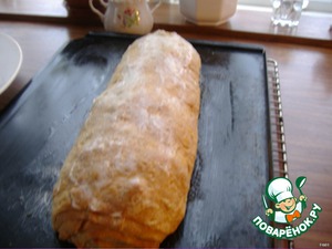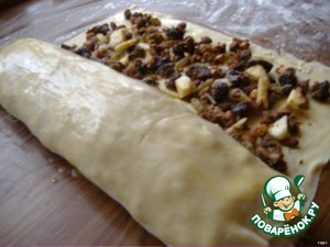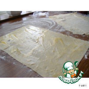 Листы слоеного теста, уложенные внахлест, хорошо смазанные растопленным маслом, покрытые начинкой, завернуть в рулет.