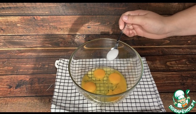 Дальше начинаю готовить тесто. К яйцам добавляю соль и начинаю взбивать миксером на маленьких оборотах.