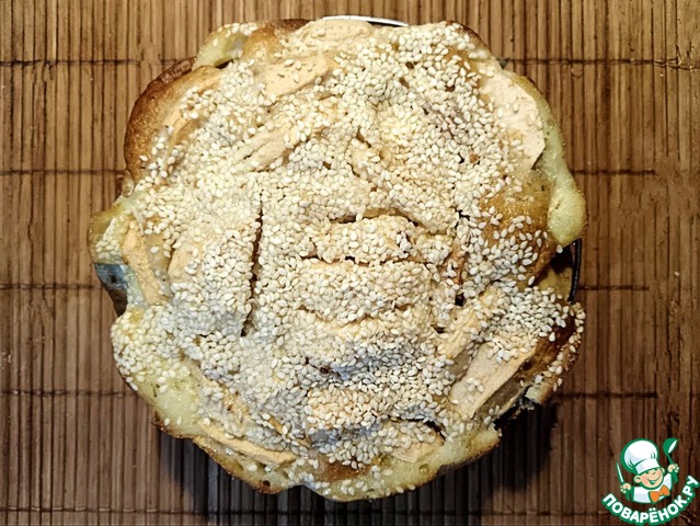 5. Спустя 30 минут достаем пирог, поливаем заливкой, посыпаем миндальными лепестками, возвращаем в духовку и выпекаем ещё 10-12 минут.