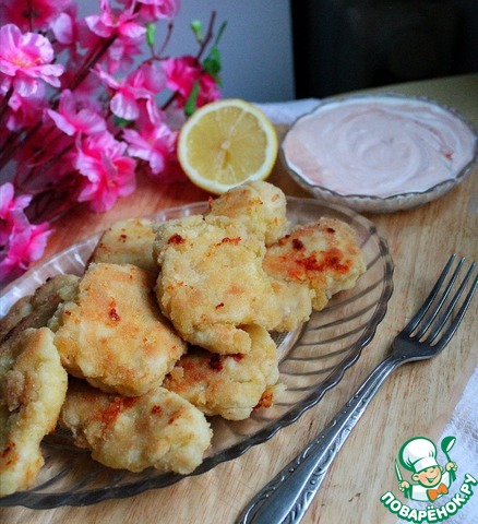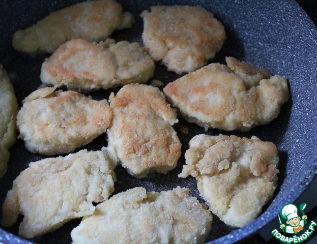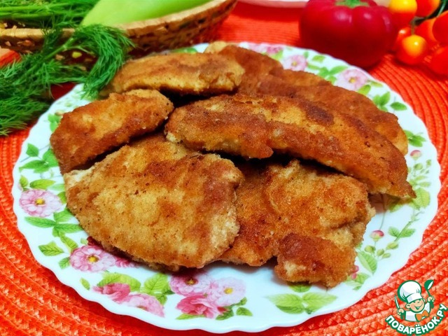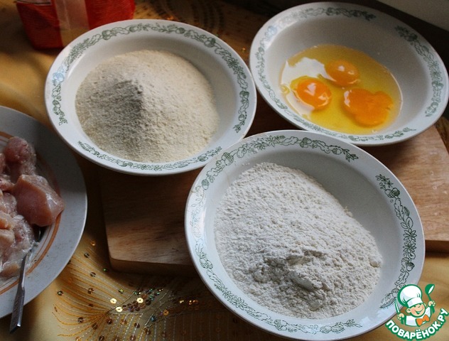 Теперь берем филе и обмакиваем в муке, потом яйце, а затем в панировочных сухарях. Так проделываем со всеми кусочками.