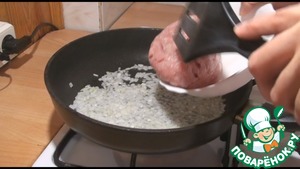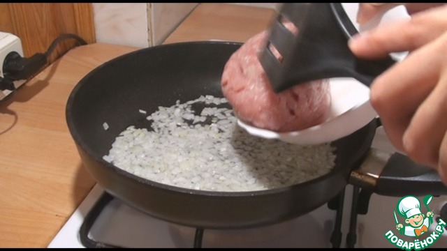 На небольшом количестве растительного масла обжарим нарезанную луковицу, чтобы она стала прозрачной. Потом добавляем фарш.