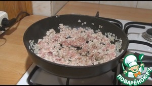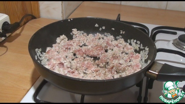 Перемешаем, лопаткой разобьем фарш на маленькие кусочки. Посолим, поперчим по вкусу, обжарим минуты 3-4.