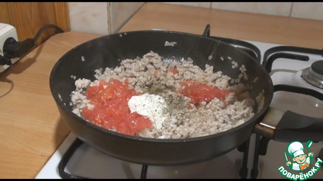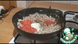 Добавляем один небольшой помидор, натертый на терку и две столовые ложки сметаны. Я ещё добавила немного прованских трав. Перемешаем и потушим минут 10 до готовности мяса. Потом переложим в другую посуду и оставим остывать.